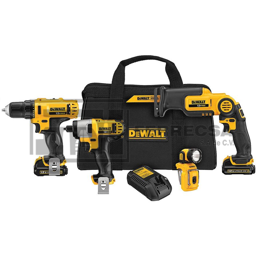 Juego Herramientas Inalámbricas 12V que incluye: DCD710 - Taladro Destornillador de 3 8 - Compacto y liviano para trabajo en áreas estrechas. - Luz LED permite trabajar en lugares obscuros. - Broquero sin llave con manguito único de 3 8 pulgada (10 mm) - Velocidad doble 0-400 0-1,500 RPM DCS310B - Sierra Recíproca de Velocidad Variable - Mango se coloca en 3 posiciones - 3 luces LED para trabajar en lugares obscuros - Velocidad 0 a 2700 Carreras por Minuto - Longitud de Carrera: 9 16 pulgada - Cambio rápido de hoja, sin herramientas. - Mango sobre-moldeado en goma para mayor control y comodid